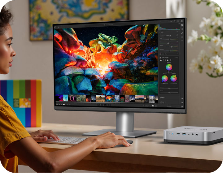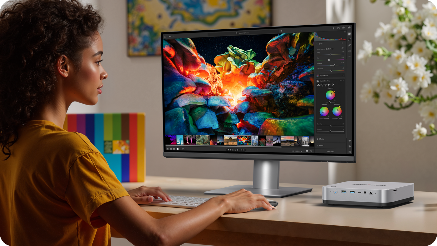 Triple NVMe and multi-display output keep editing and asset work flowing.Separate project, cache, and library drives for faster loading and smoother timelines, then spread your tools across multiple screens for a workstation feel in a mini footprint.