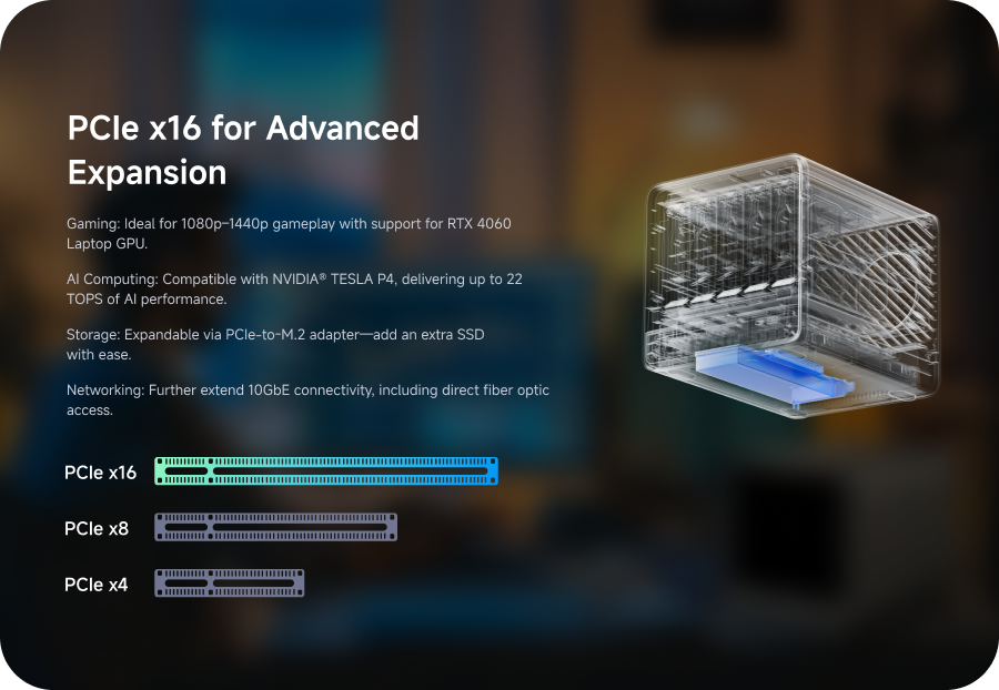 MINISFORUM's slide-out motherboard allows quick RAM and SSD upgrades, simplifying maintenance. Modular design supports standard RAM, avoiding onboard limits for flexible upgrades.
