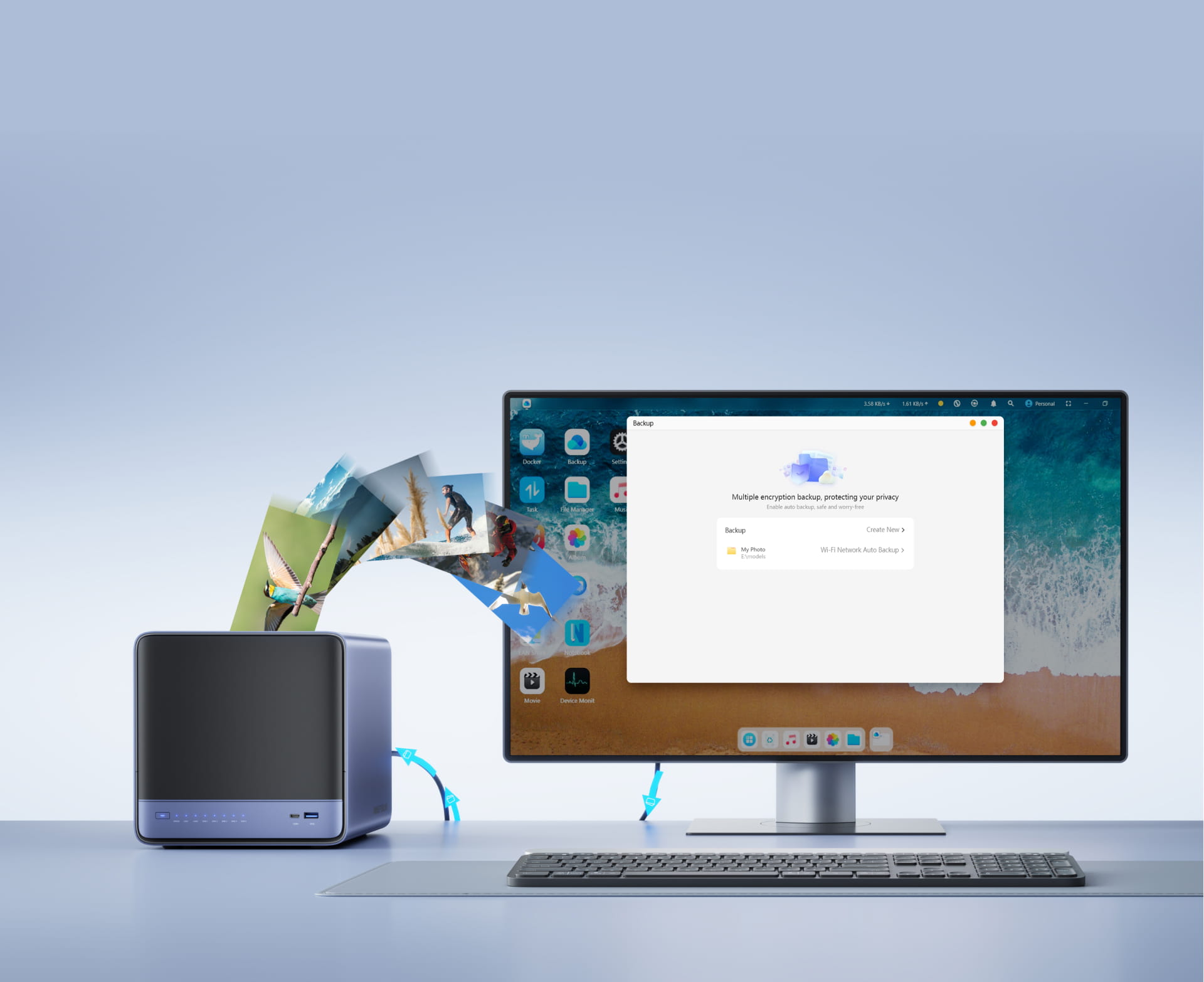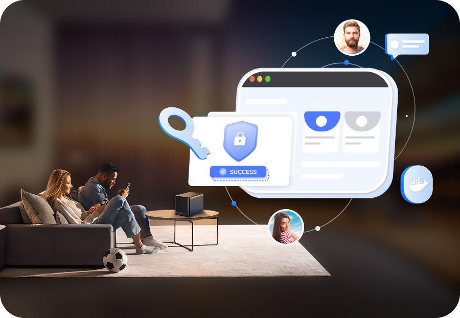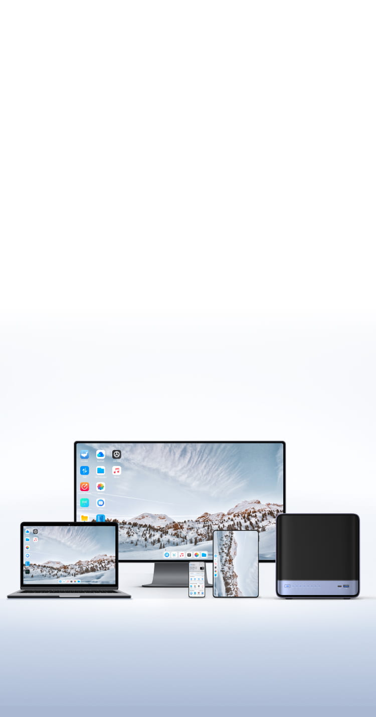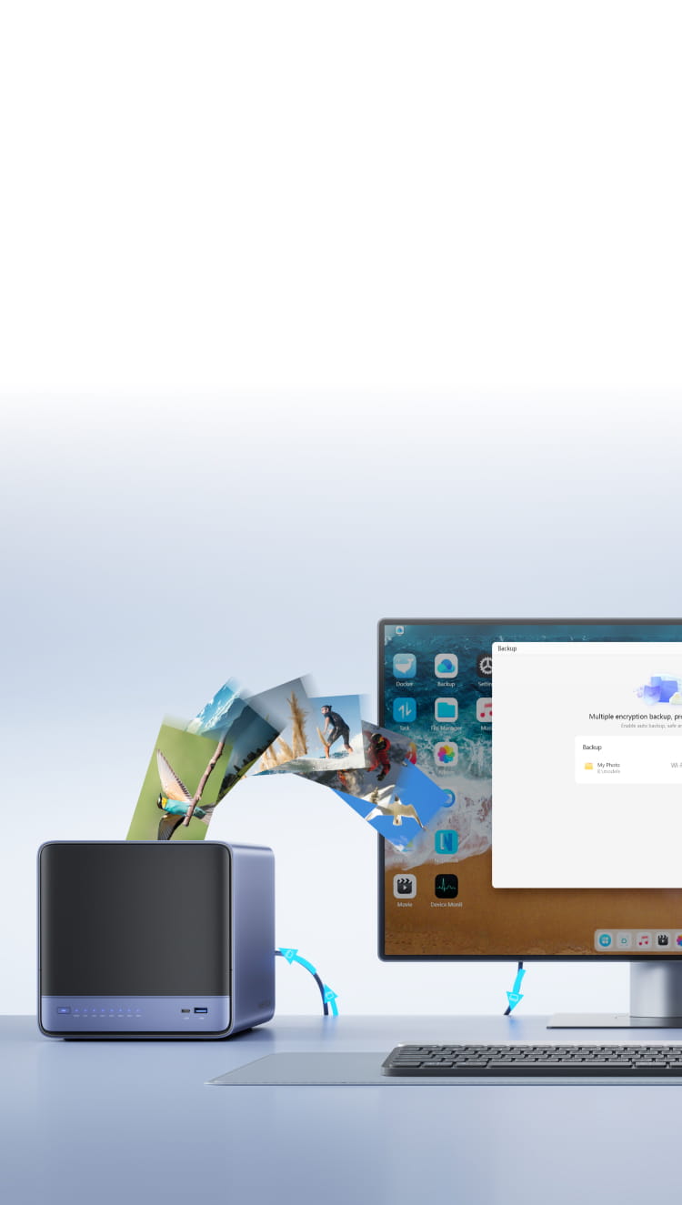 Built-in features include ZFS snapshots, LZ4 compression, multi-user isolation, Docker apps, AI photo albums, and one-click remote access-fully managed, ready to use.