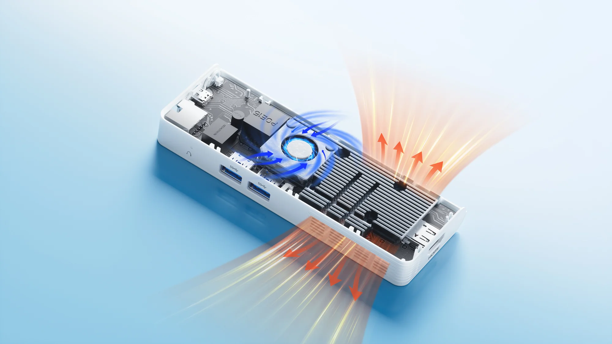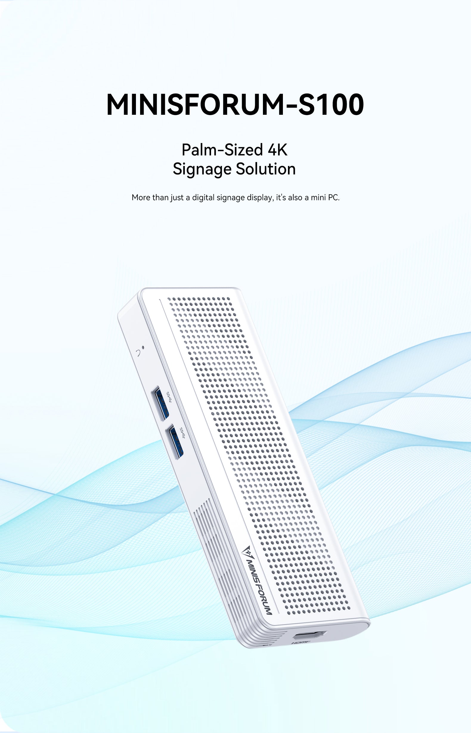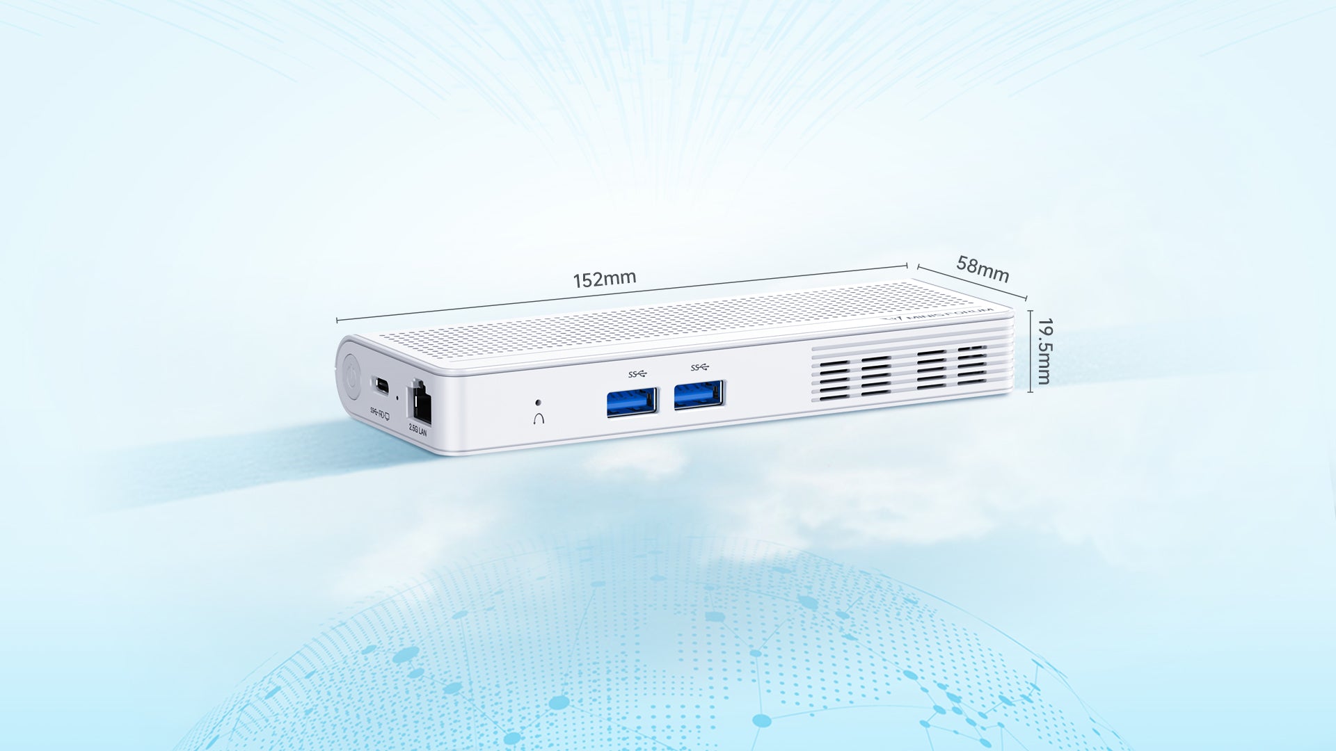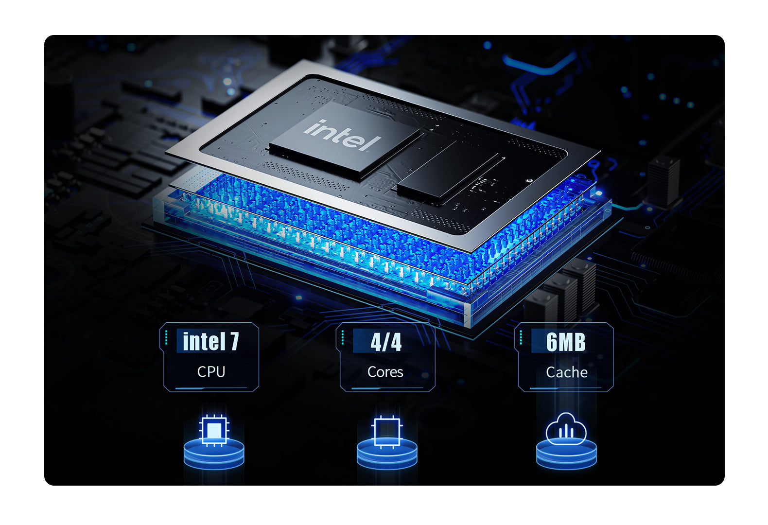 The S100 features the Intel® N100 processor with 4 cores and 4 threads, 6MB of cache, a base clock speed of 1.8 GHz, and turbo boost capability up to 3.4 GHz. It includes integrated Intel® UHD Graphics and operates at a low TDP power consumption of 6W, making it more energy-efficient than other processors. Additionally, the Turbo Boost performance can be increased to release up to 9W when needed.