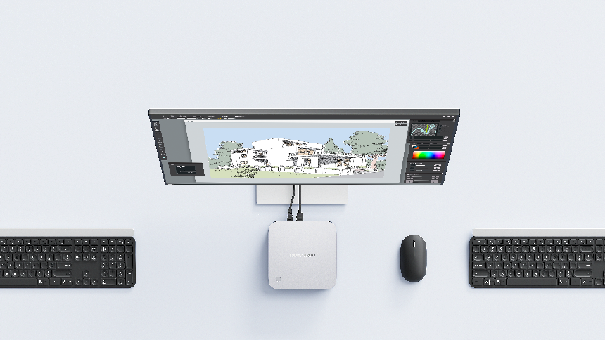 If you want a computer that doesn't take up much space at home or in the office, a mini PC is a great option. It can be mounted on the back of a monitor or under a desk via VESA Mount, keeping your desktop tidy and organized.