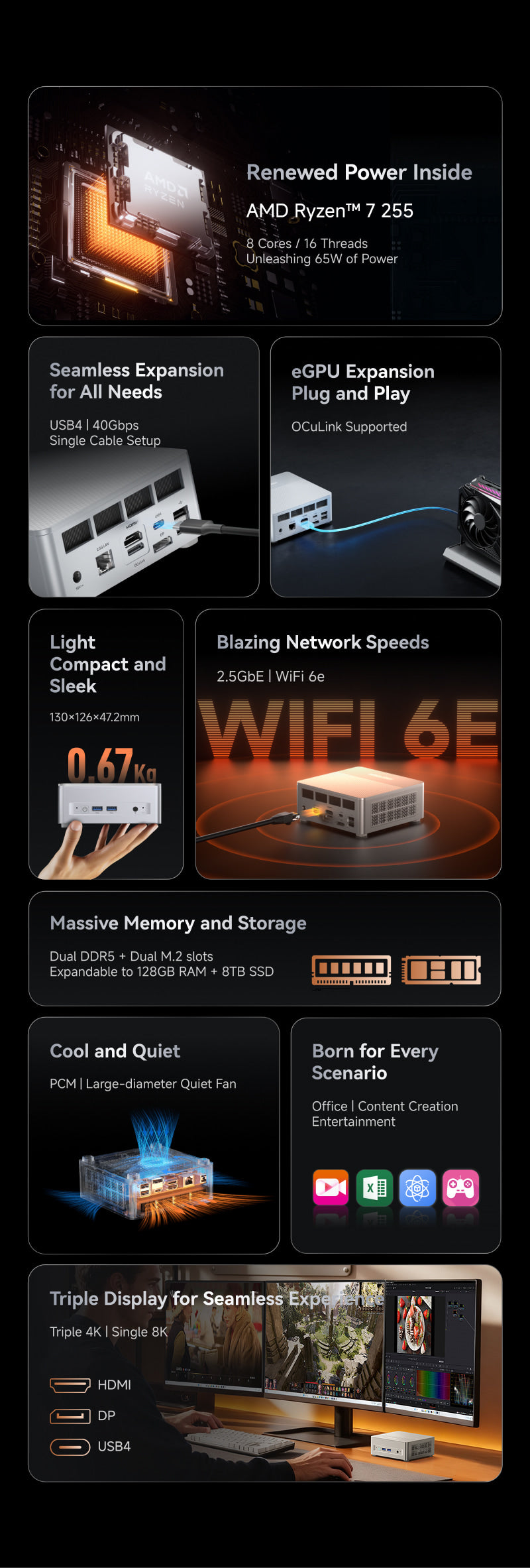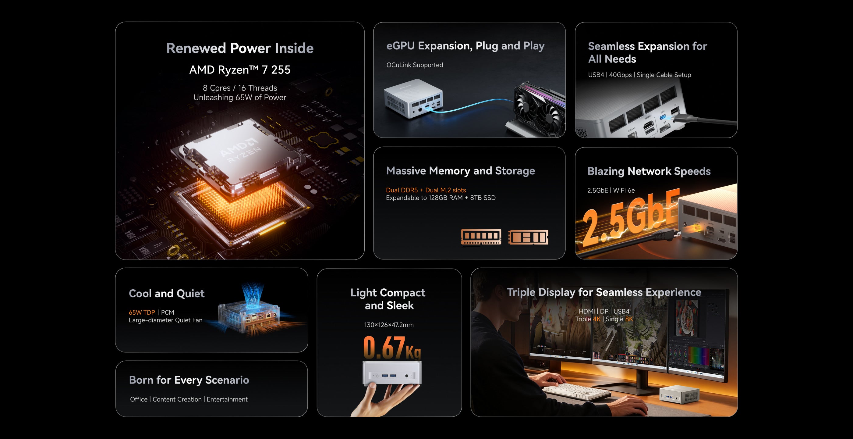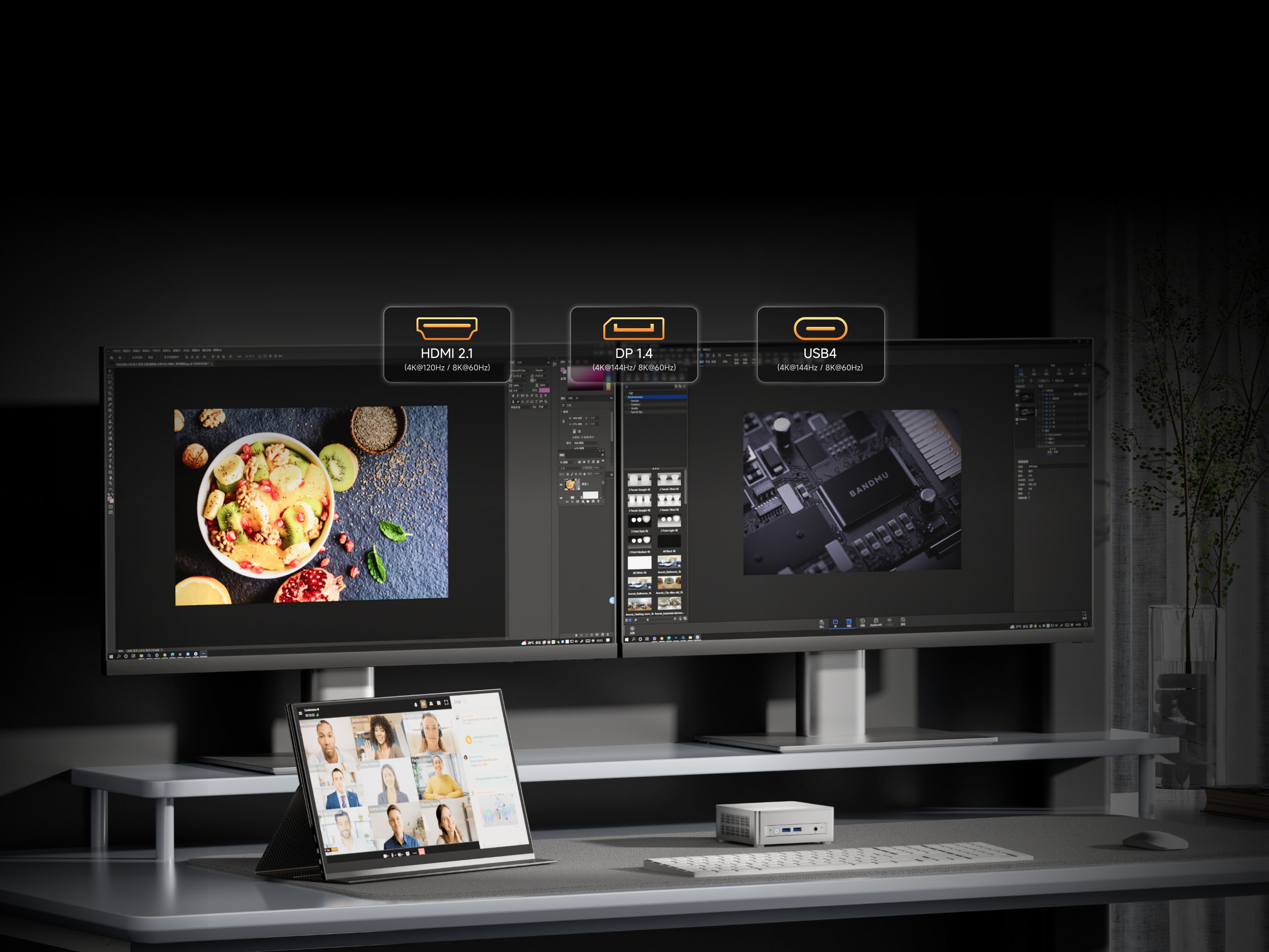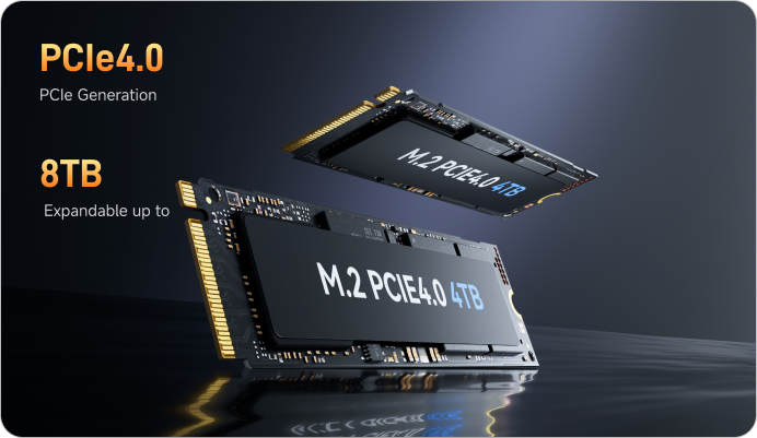 Dual channel DDR5 + Dual M.2 SSD slots, configurable up to 64GB RAM + 1TB SSD, expandable to 128GB RAM + 8TB SSD