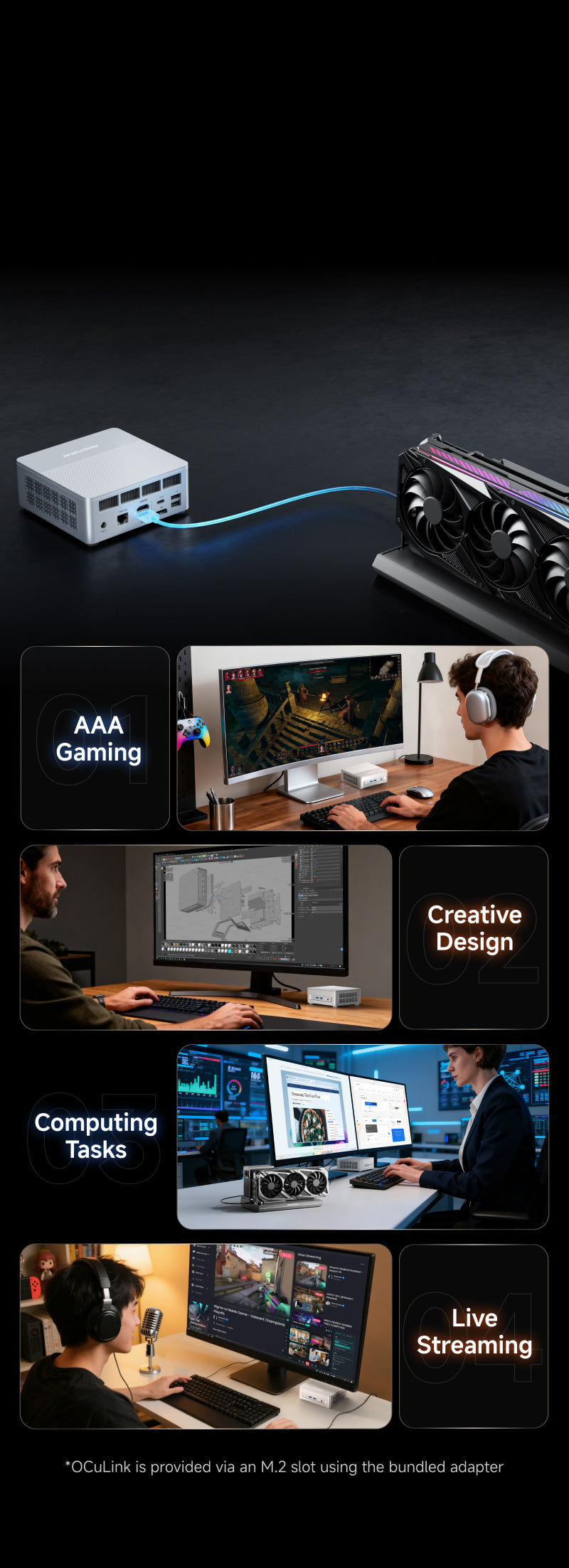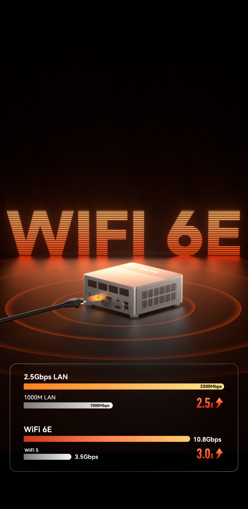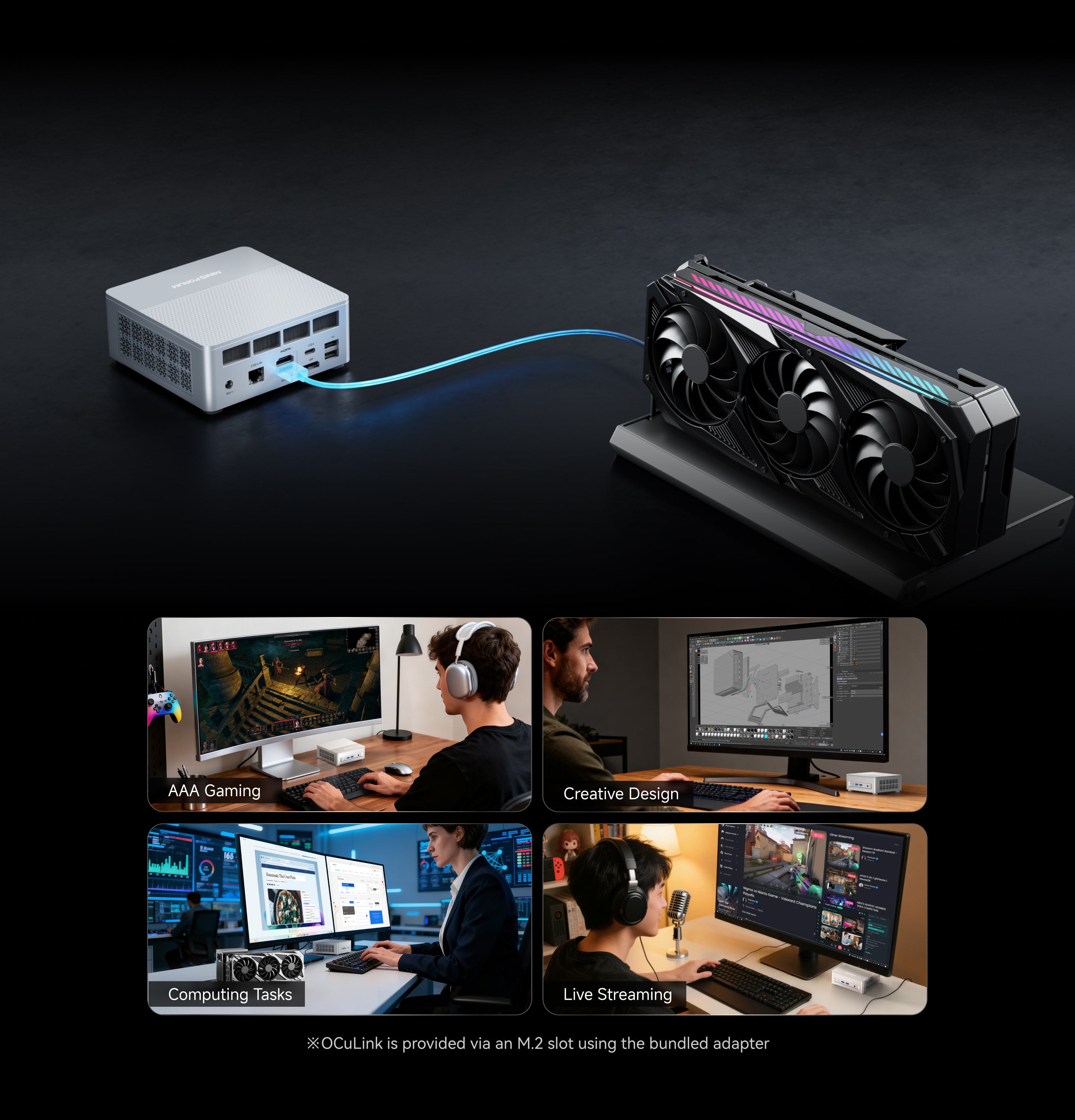 Dual channel DDR5 + Dual M.2 SSD slots, configurable up to 64GB RAM + 1TB SSD, expandable to 128GB RAM + 8TB SSD