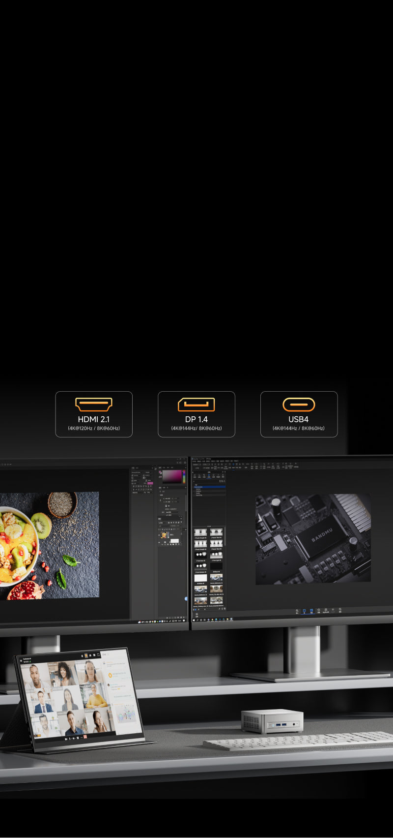 HDMI 2.1 FRL × 1 (Up to 8K@60Hz/4K@120Hz)DP 1.4 × 1 (Up to 8K@60Hz/4K@144Hz)USB4 × 1 (Up to 8K@60Hz/4K@144Hz)