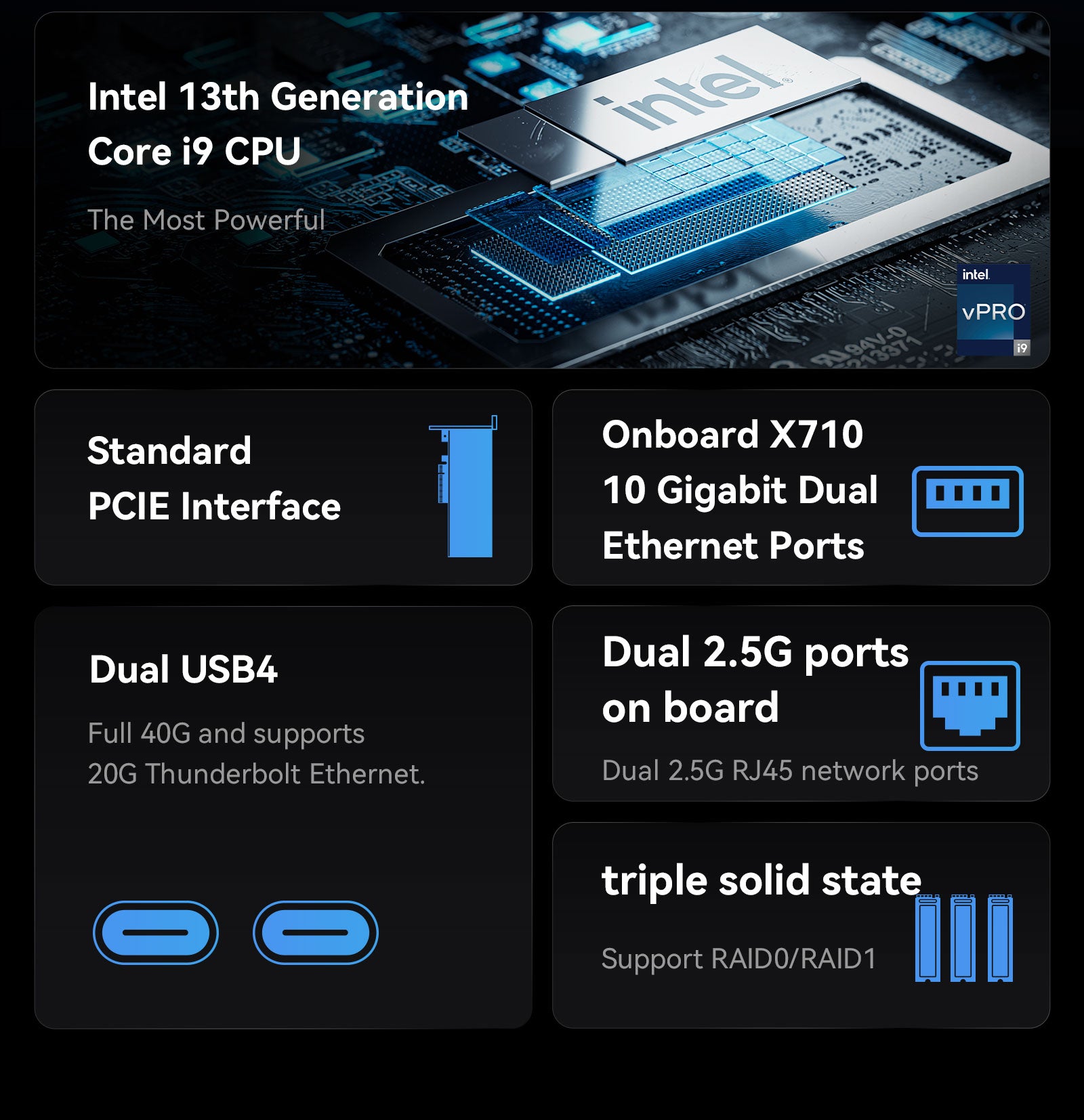 The MS-01 is capable of building a high-speed network experience with two 10Gbps SFP+ LAN ports, two 2.5Gbps RJ45 LAN ports, and two USB4 ports, providing a total maximum Ethernet throughput of 65Gbps. Enjoy an unprecedented high-speed networking experience.