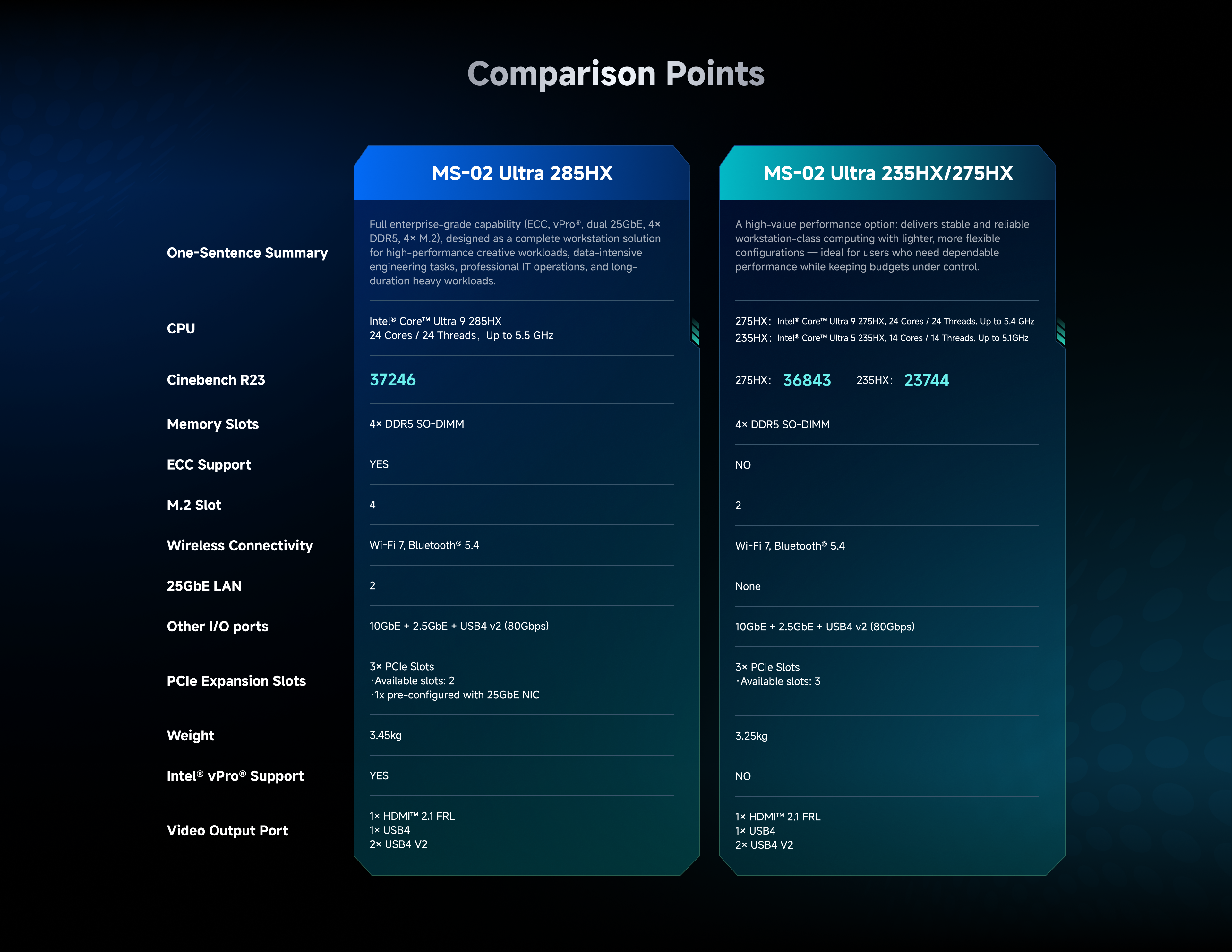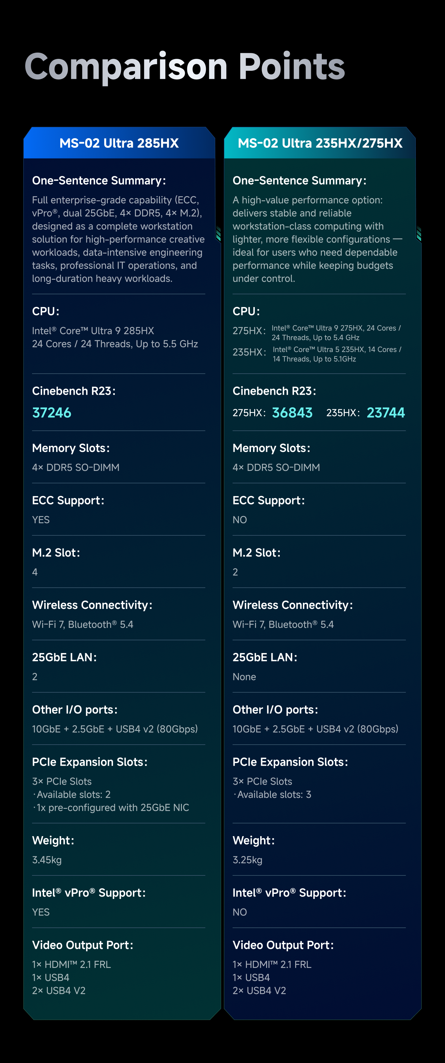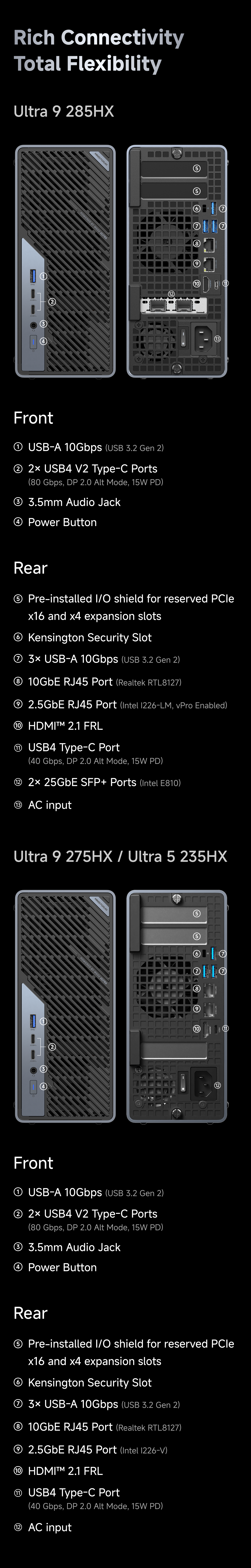* M.2 slot count: 285HX: 4 slots; 275HX/235HX: 2 slots.