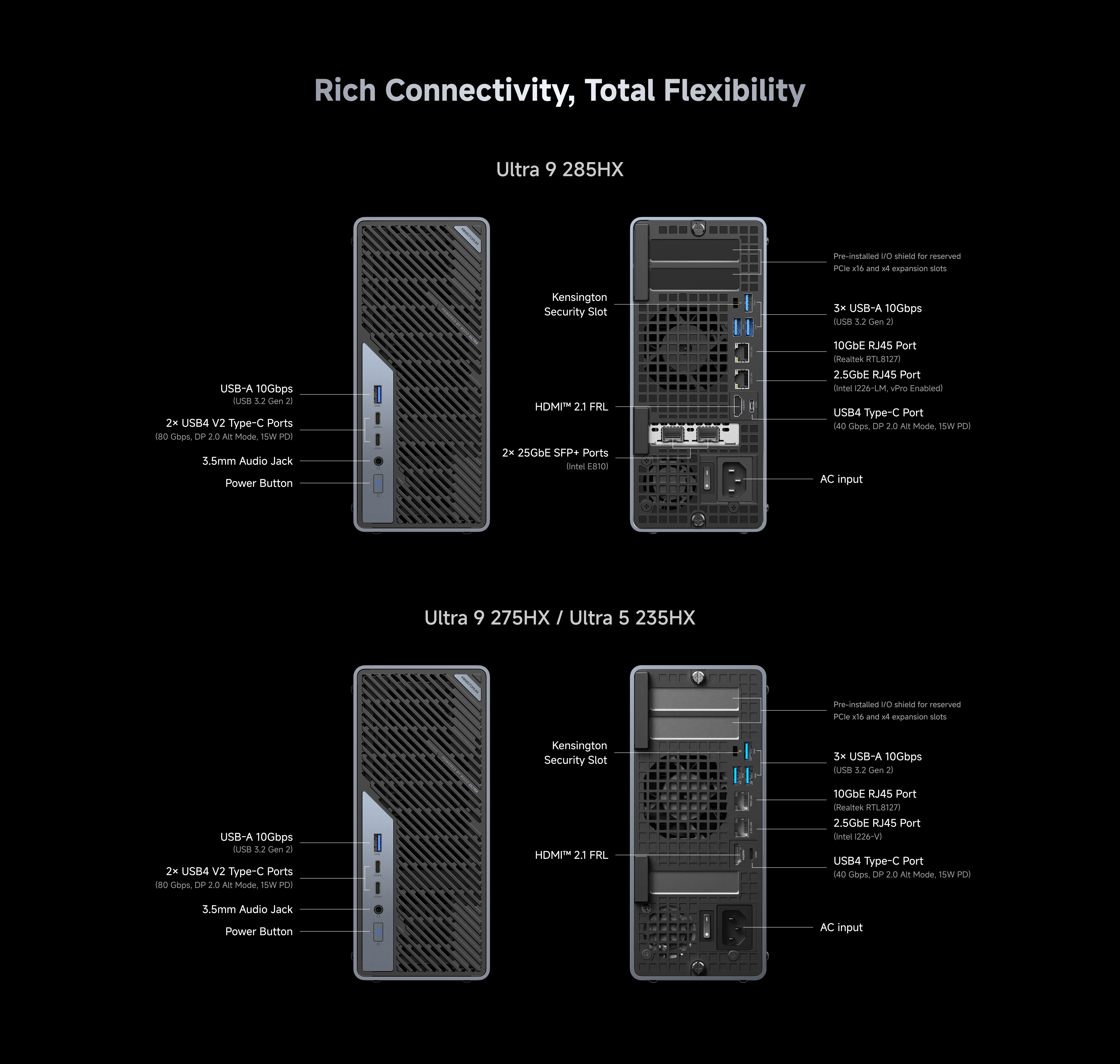 - 1 × 10GbE | 2.5GbE RJ45 | WiFi 7 & BT 5.4