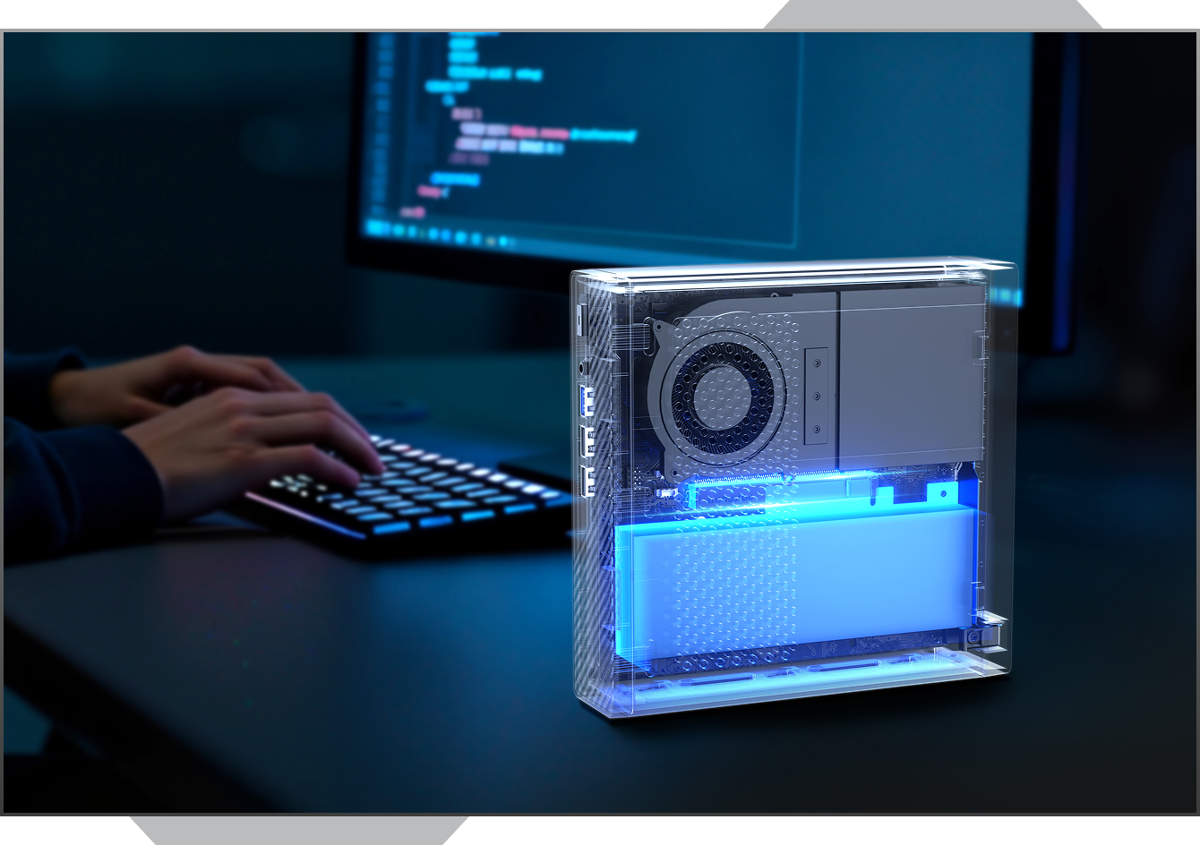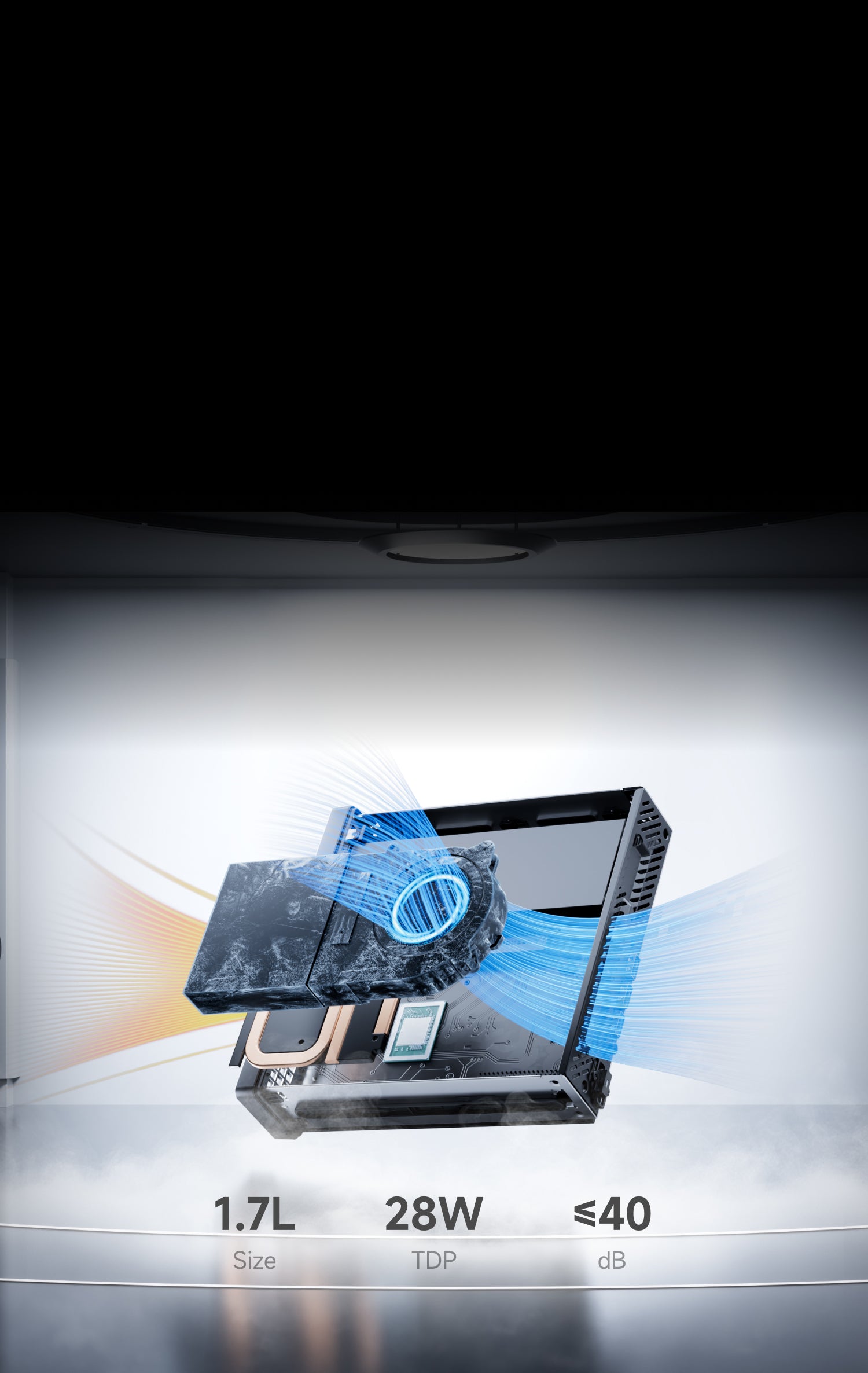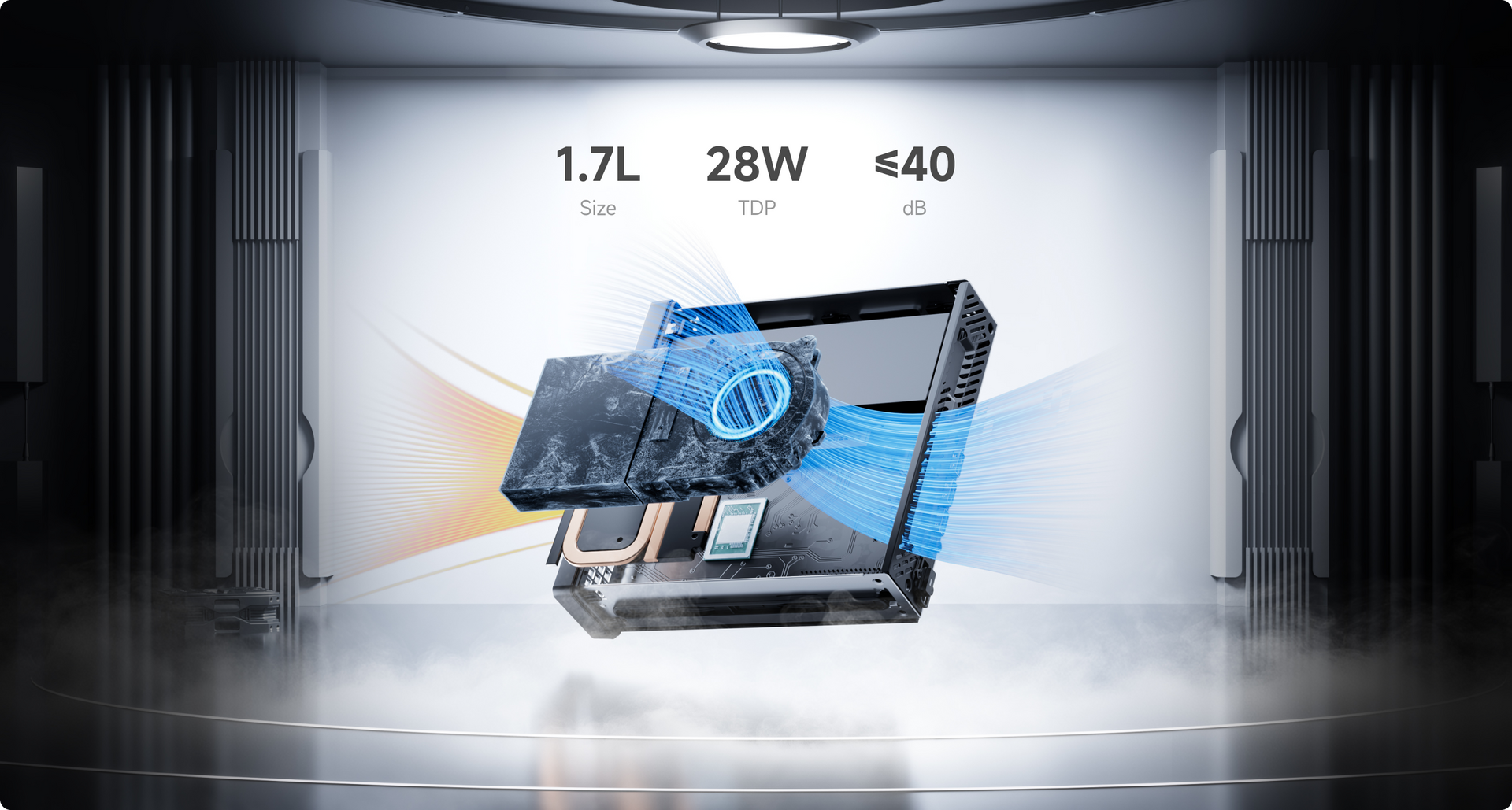Just 1.7L in size with only 28W TDP, MS-R1 runs under 35dB while delivering workstation-class performance. Its advanced cooling system integrates triple copper heat pipes, a turbine fan, aerodynamic vortex channels, and phase-change thermal materials - precision-engineered for stable power in a compact chassis.