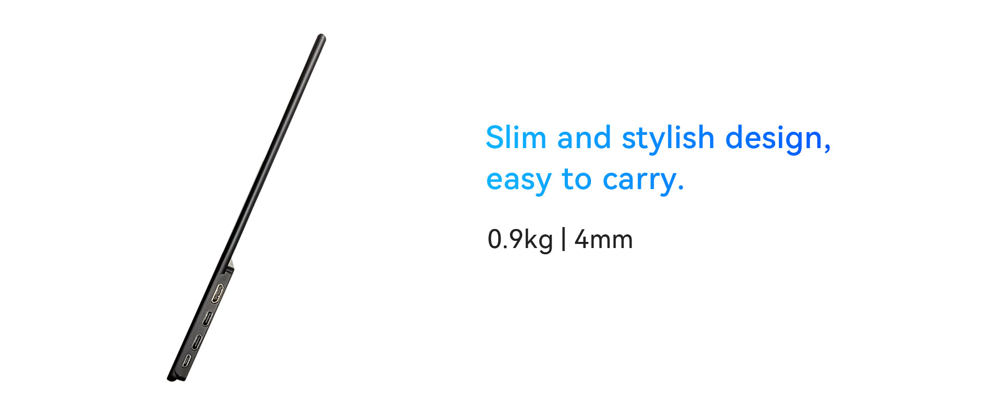 The thin, frameless design offers full protection for the monitor's surface and back panel. The protective case doubles as a stand, allowing for landscape or portrait viewing modes with magnetic attachment for convenience in various usage scenarios.